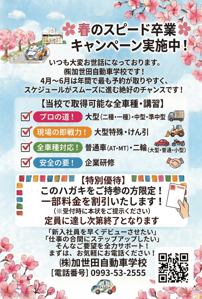 加世田自動車学校では4~6月に比較的教習が進めやすいため、